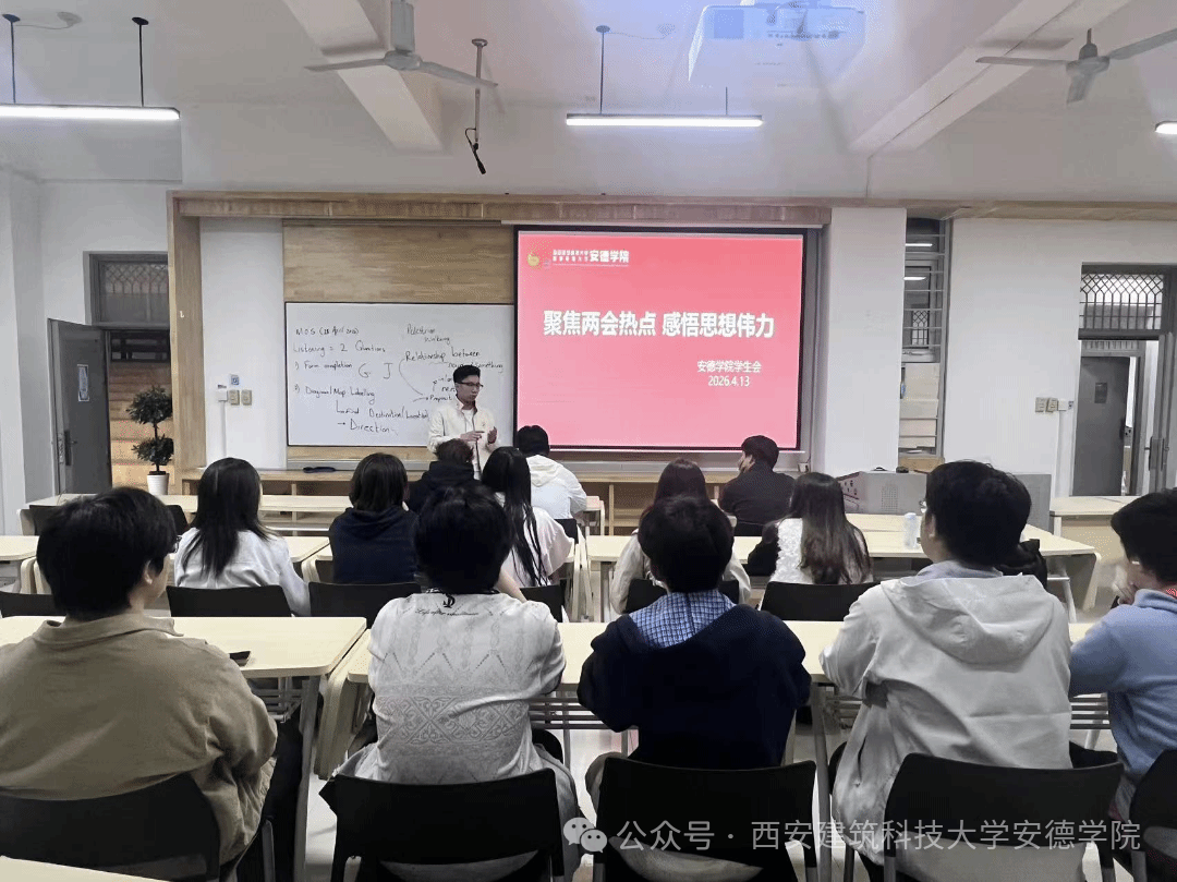 随着2026年全国两会圆满落幕,为引导全院同学深刻领会时代内涵,坚定理想信念。安德学院学生会于4月13日在学府城10-108教室组织开展“聚焦两会热点 感悟思想伟力”专题学习会。本次学习会由安德学院学生会执行主席遇世佳主持。